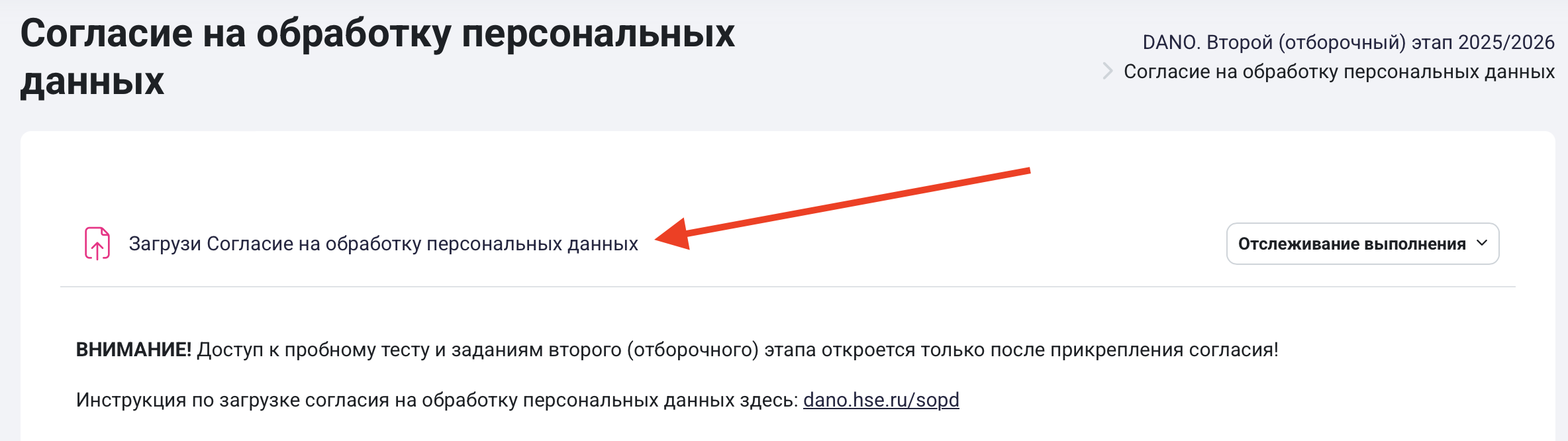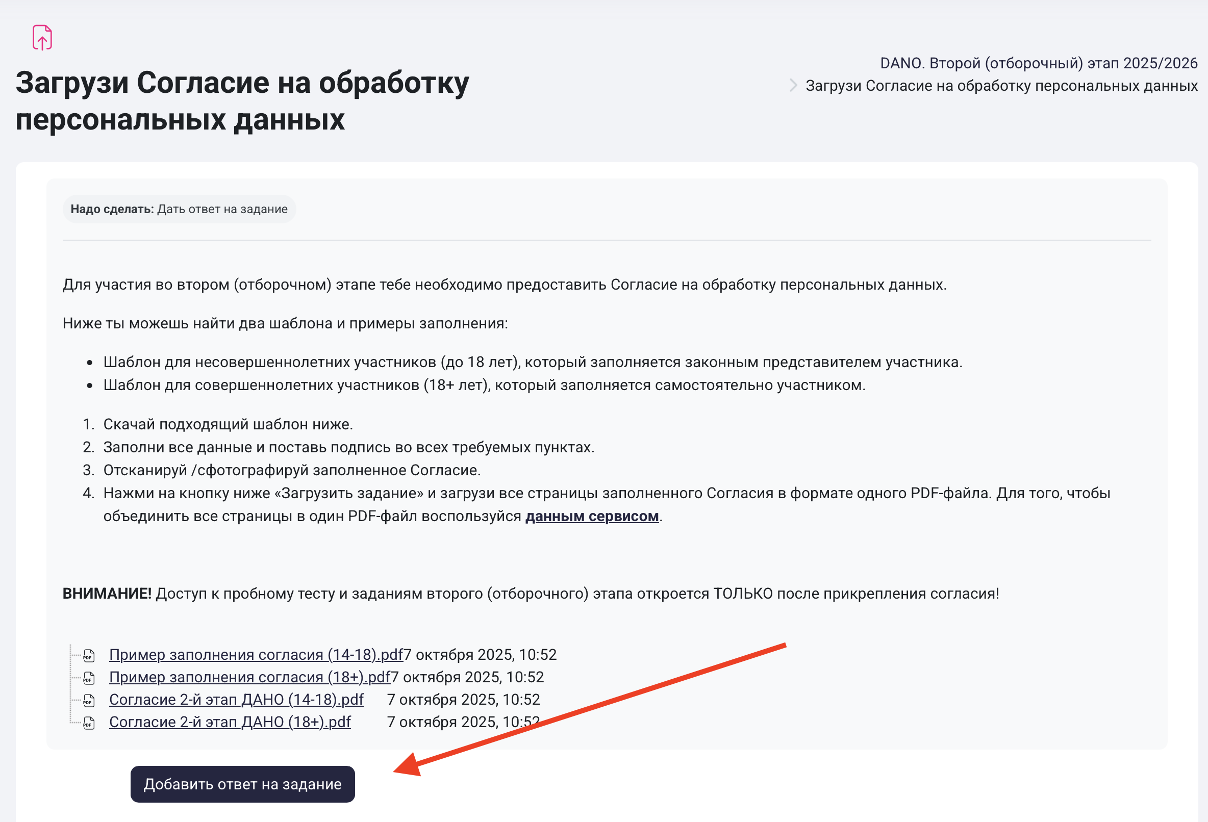 Доступ к пробному тесту и заданиям второго (отборочного) этапа откроется только после загрузки скана заполненного согласия!